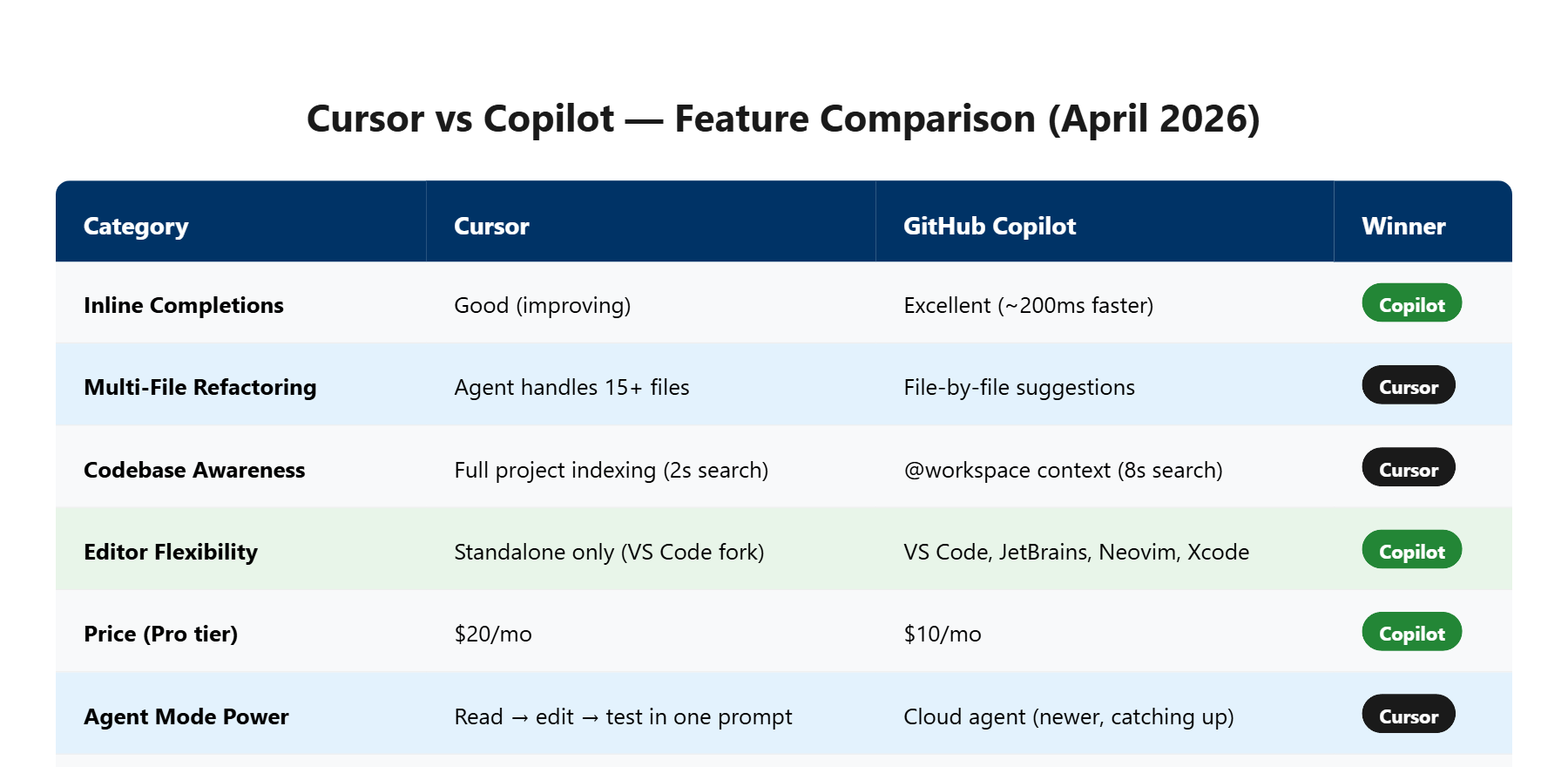 For single-line completions, Copilot responds about 200ms faster on average. For multi-file edits, Cursor’s Agent mode handles changes across 15+ files in a single prompt.
