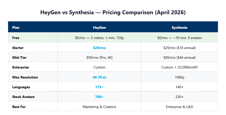 | Plan | HeyGen | Synthesia |