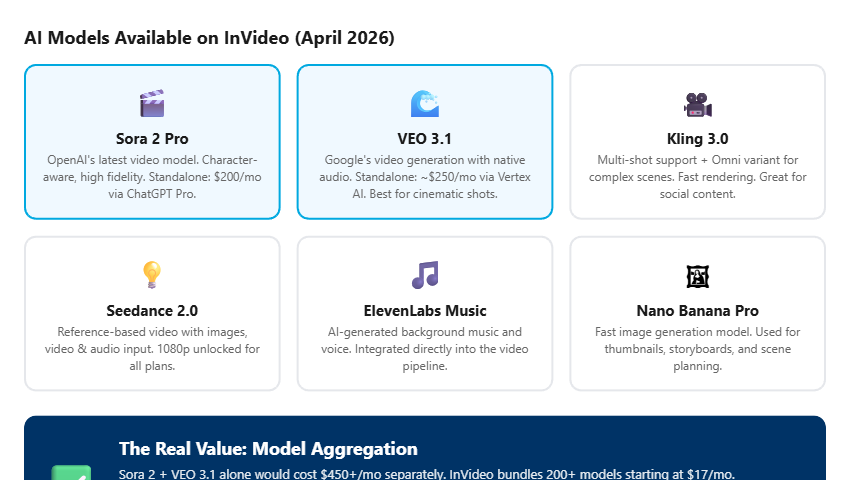 Think about it: accessing Sora 2 directly through ChatGPT Pro costs $200/month with heavy usage limits. VEO 3.1 through Google’s Vertex AI runs close to $250/month standalone. InVideo bundles both — plus Kling 3.0, Seedance 2.0, Nano Banana Pro, and dozens more — starting at $17/month.